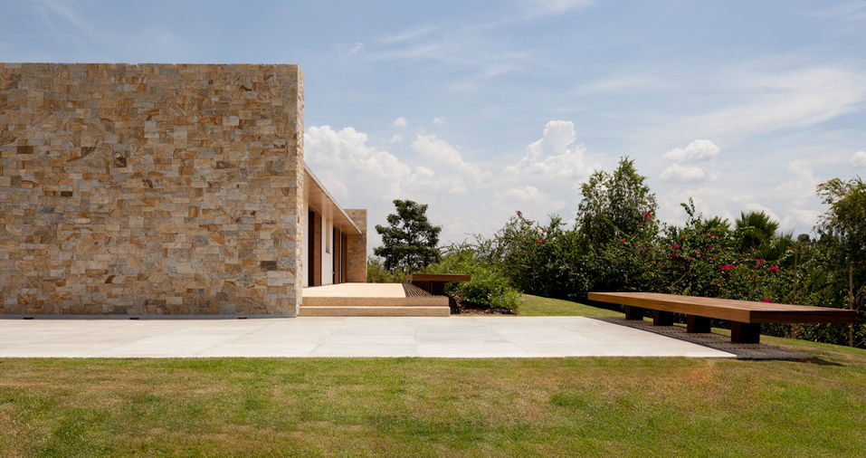 Residência térreo, implantada na diagonal do terreno de modo a valorizar a melhor vista. Composição de muros de pedra, volumes de massa texturizada e revestimentos de madeira. Os pisos externos e áreas de varanda são como uma extensão da casa, que se prolonga em direção ao jardim. A fachada tem muro que serve para separar o espaço da rua da casa e é um pórtico de entrada para o acesso principal.