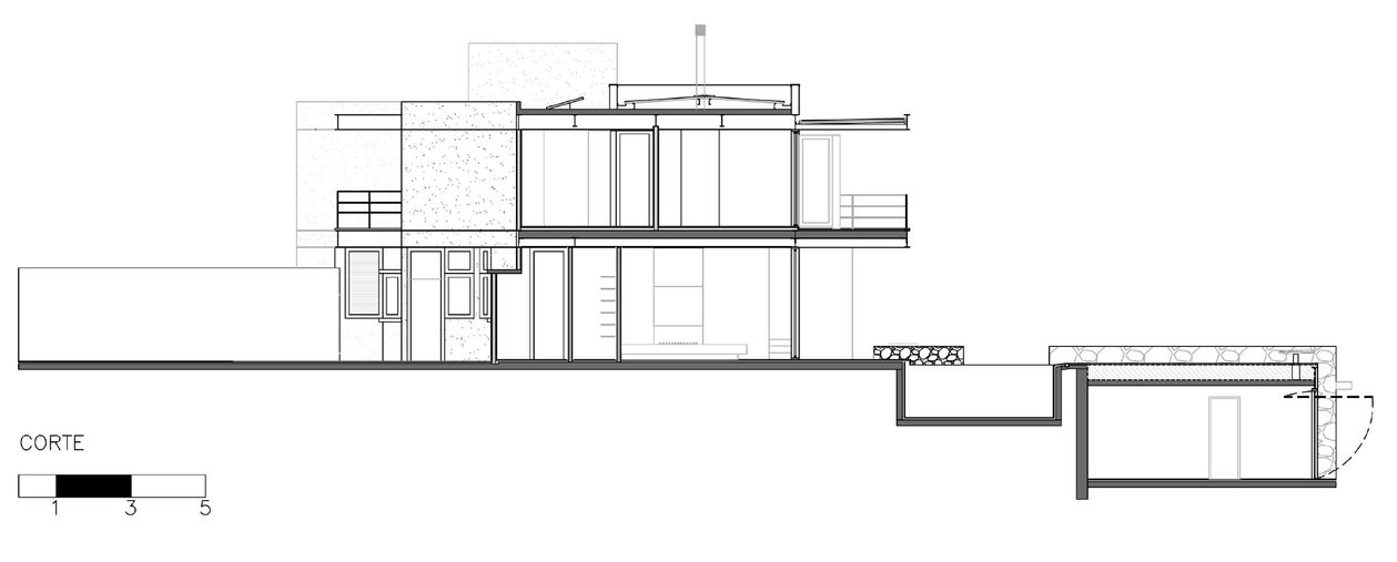 Residência de estrutura mista de aço e concreto, implantada em terreno em aclive, onde a garagem fica no nível da rua. O terreno é formado por um platô, que junta o restante do terreno com a cobertura da garagem. No térreo elevado ficam as áreas sociais e de serviço, com as salas integradas à varanda e ao jardim com piscina. As árvores existentes no terreno foram preservadas e a casa foi integrada à vegetação do entorno.